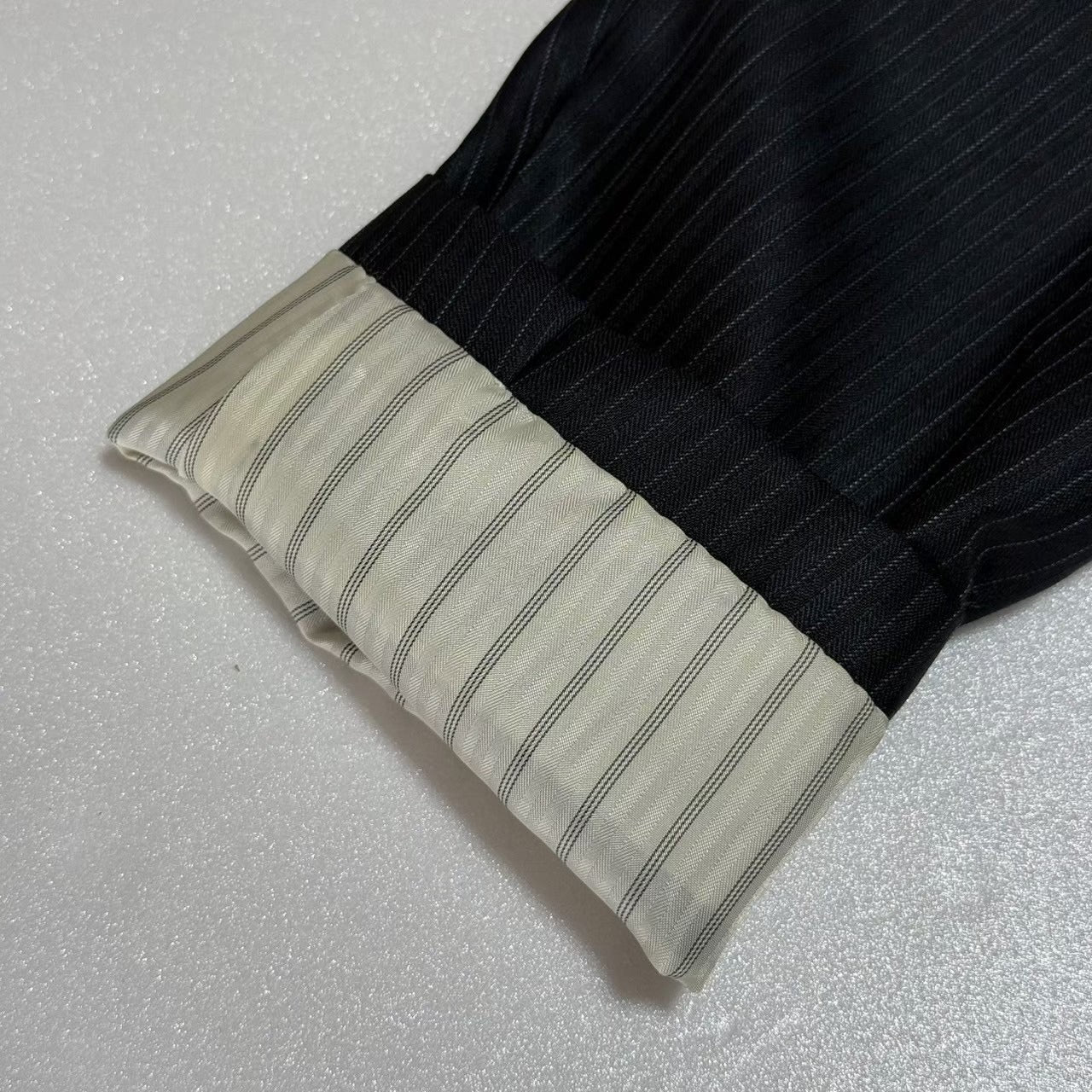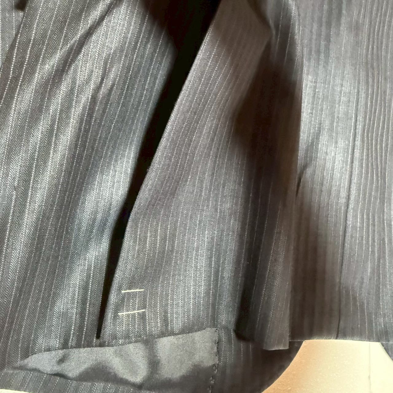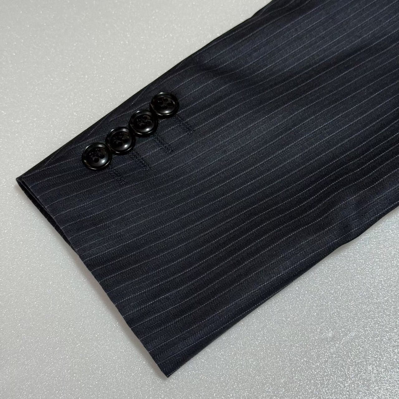 商品説明 | 平置き採寸:シャケット:肩幅42cm/身幅49cm/着丈67cm/裾丈57cm/ベントの長さ22.5cm パンツ:ウエスト37.5×2cm /股下84cn/裾幅20cm ズボン2枚/光沢感あり/ストライプ |
