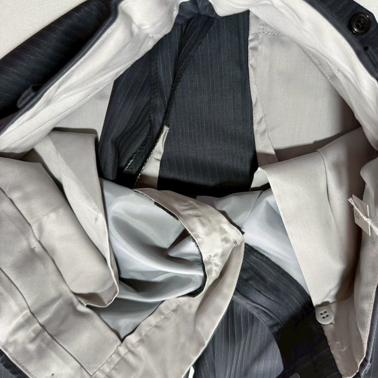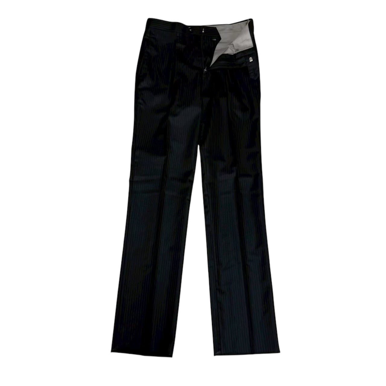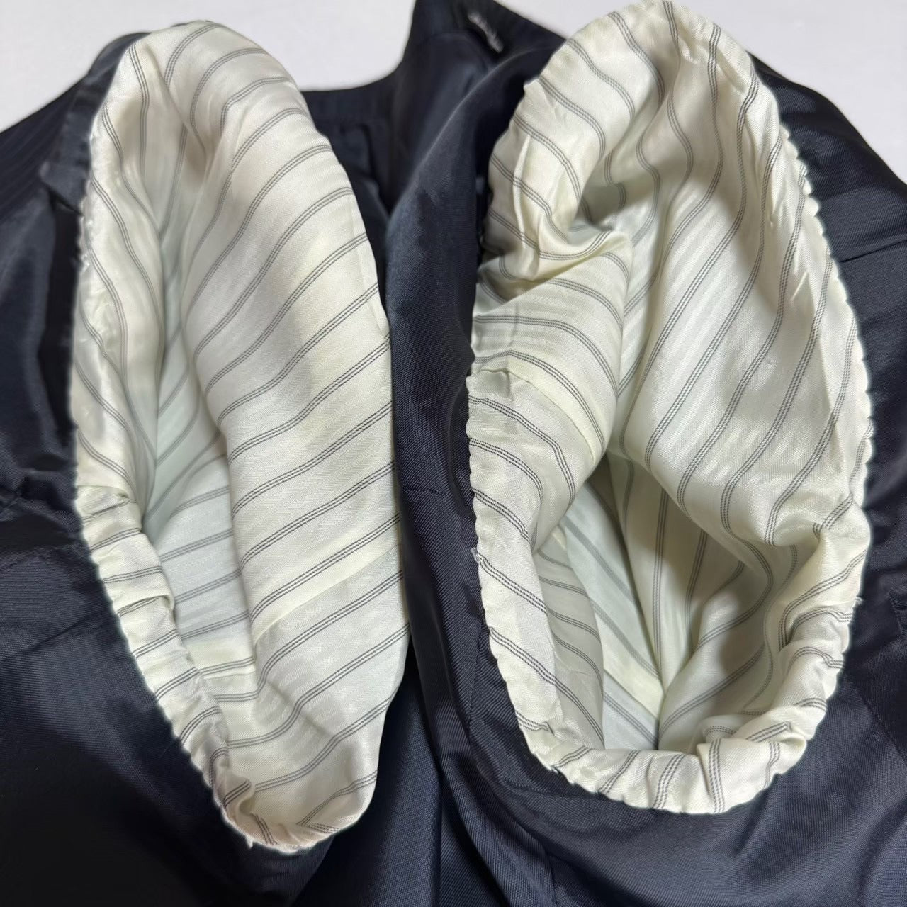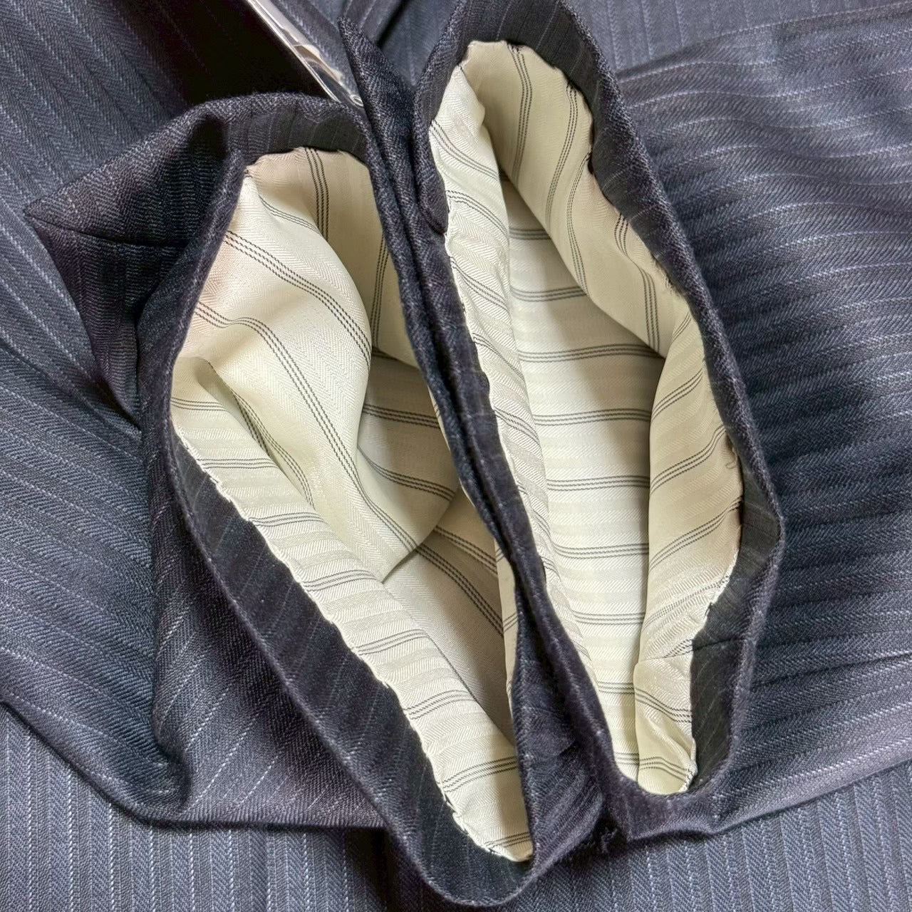 商品説明 | 平置き採寸:シャケット:肩幅42cm/身幅49cm/着丈67cm/裾丈57cm/ベントの長さ22.5cm パンツ:ウエスト37.5×2cm /股下84cn/裾幅20cm ズボン2枚/光沢感あり/ストライプ |